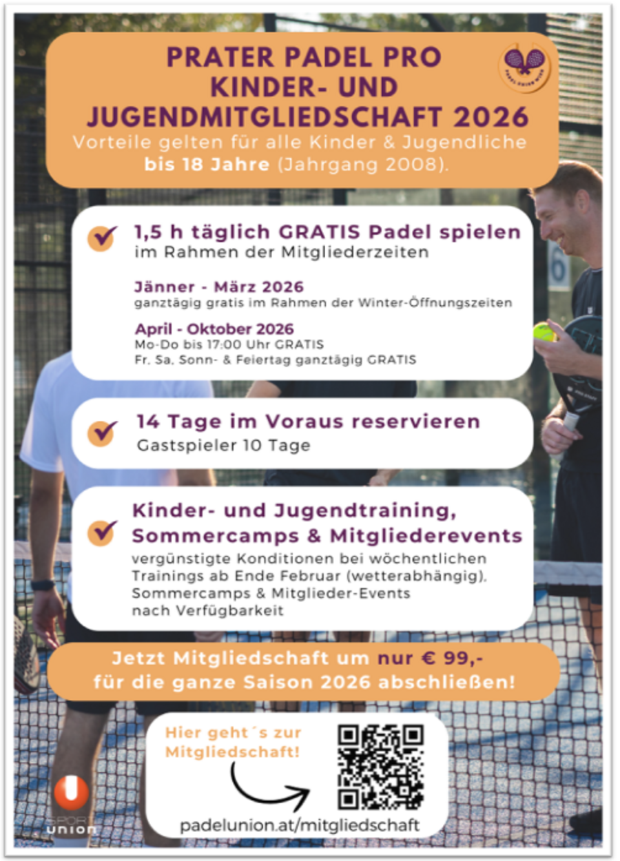 Jugendmitgliedschaft bis einschließlich Jahrgang 2008 (Ausweiskopie an prater@padelunion.at schicken).