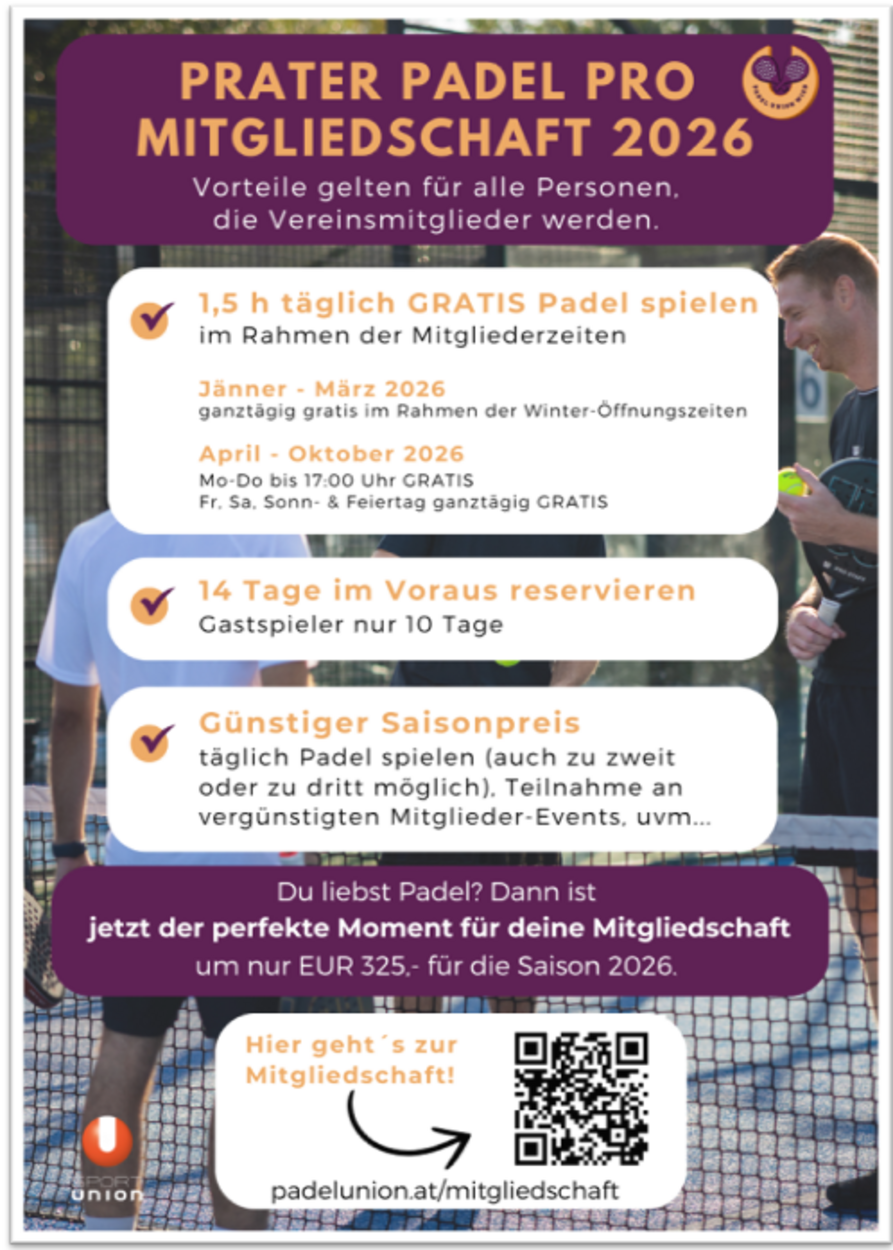 - Erwachsenenmitgliedschaft: Prater Padel Pro Mitgliedschaft 2026 / Vor- und Nachname