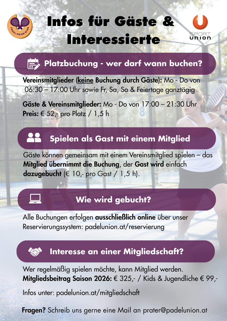 | Als Vereinsmitglied hast du viele Vorteile, einige davon sind: - Gratis Padel spielen innerhalb der Mitgliederzeiten (auch zu zweit oder dritt) / bereits ab Jänner möglich (Gastspieler können erst ab April buchen) - 14 Tage im Voraus reservieren zu allen Zeiten (Gäste können nur 10 Tage im Voraus Mo - Do 17:00 - 21:30 Uhr reservieren) - Vergünstigte Konditionen bei Mitgliederevents - Vergünstigte Kinder- und Jugendtrainings (immer samstags) und Sommercamps |